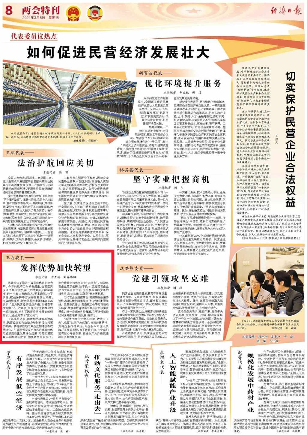 民營(yíng)經(jīng)濟(jì)是推進(jìn)中國(guó)式現(xiàn)代化的生力軍。今年的政府工作報(bào)告提出,全面落實(shí)促進(jìn)民營(yíng)經(jīng)濟(jì)發(fā)展壯大的意見及配套舉措,進(jìn)一步解決市場(chǎng)準(zhǔn)入、要素獲取、公平執(zhí)法、權(quán)益保護(hù)等方面存在的突出問題。全國(guó)政協(xié)委員、新大陸科技集團(tuán)CEO王晶表示,“助力民營(yíng)經(jīng)濟(jì)提質(zhì)升級(jí),關(guān)鍵在于提振信心”。近年來(lái),圍繞企業(yè)關(guān)切推出的一系列政策,補(bǔ)齊了民營(yíng)經(jīng)濟(jì)發(fā)展的短板弱項(xiàng),讓企業(yè)吃下了“定心丸”。