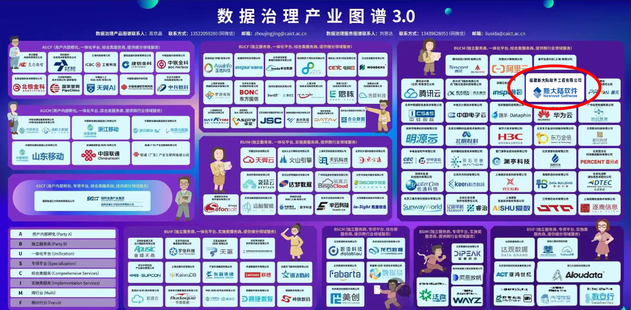會上,大數據技術標準推進委員會正式發布了《數據治理產業圖譜3.0》,旨在通過梳理數據治理相關產品及服務的市場現狀,洞察數據產業發展現狀及未來發展趨勢,為各方在數據治理領域的布局規劃和未來發展提供參考。新大陸軟件入選《數據治理產業圖譜3.0》BUCM板塊(獨立服務商、一體化平臺、綜合類服務商、提供跨行業領域服務)。從1.0到2.0,再到3.0,新大陸軟件連續三屆入選《數據治理產業圖譜》,這不僅是對新大陸軟件在數據治理領域持續深耕的充分肯定,更是對其在推動數據治理產業發展方面所做貢獻的高度評價。