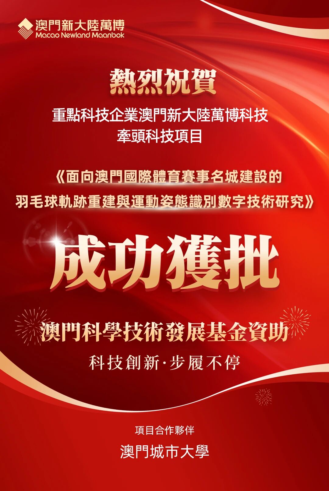 近日,由澳門特區(qū)政府重點(diǎn)科技企業(yè) —— 澳門新大陸萬(wàn)博科技牽頭,聯(lián)合澳門城市大學(xué)共同研發(fā)的《面向澳門國(guó)際體育賽事名城建設(shè)的羽毛球軌跡重建與運(yùn)動(dòng)姿態(tài)識(shí)別數(shù)字技術(shù)研究》成功獲批澳門科學(xué)技術(shù)發(fā)展基金資助。